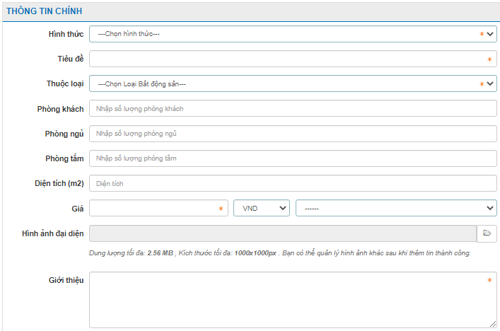 • Phải có tiêu đề: Tên của bất động sản/dự án (Ví dụ: Tên của dự án là: VN-Land Central Huế) • Nội dung mô tả tóm lược về bất động sản như: Diện tích; các tiện ích kèm theo; gần khu vực nào; thông tin liên lạc … • Địa chỉ của bất động sản: Chi tiết từ đường, phường, quận, thành phố • Giá cả của bất động sản: Ghi cụ thể giá bán của bất động sản • Ảnh chụp thực tế của bất động sản: Có tối thiểu 01 ảnh chụp liên quan bất động sản. • Chỉ được phép đăng tin với mục đích đăng mua/bán/cho thuê/thuê bất động sản (BĐS). Không được đăng các tin chỉ với mục đích quảng cáo, tiếp thị đơn thuần (nghĩa là không cung cấp bất kỳ BĐS cụ thể nào, không thể hiện nhu cầu giao dịch BĐS).