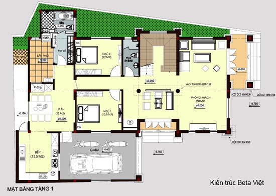 Tầng 1 gồm 1 Gara, 1 Phòng khách, 1 Phòng bếp, 1Phòng ăn, 2 Phòng ngủ, 2 WC - 1 thay đồ, 1 Sân phơi